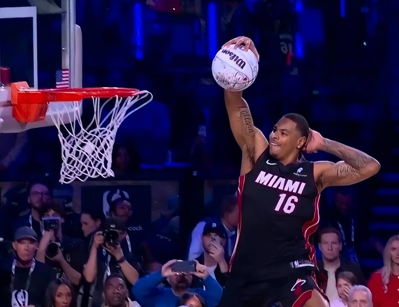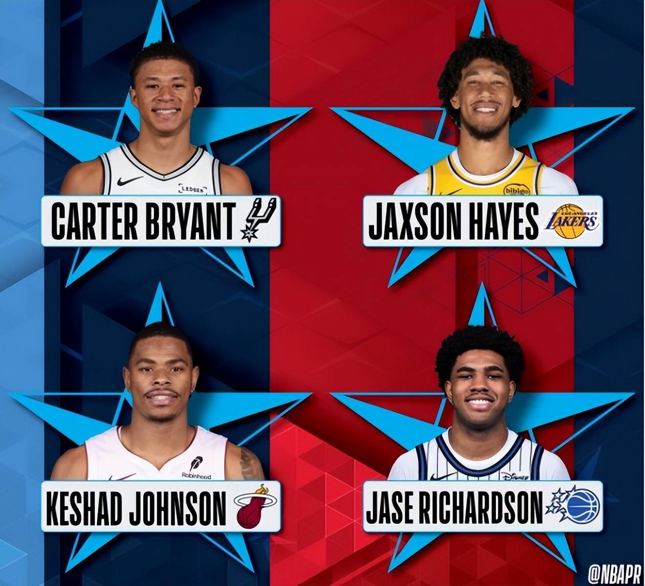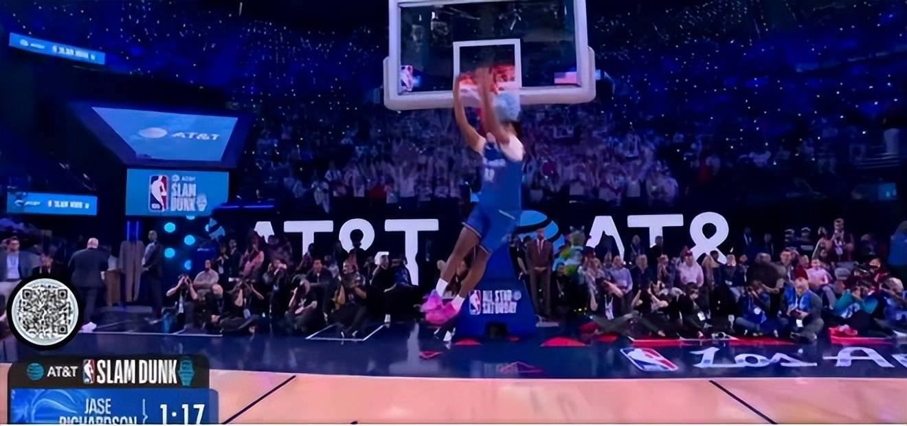 预赛阶段,马刺新秀卡特·布莱恩特率先登场,他从左侧底线启动,完成了一记流畅的接近360度转体大风车扣篮,一次成功,得到45.6分。紧随其后,魔术队的杰斯·理查德森(两届扣篮王杰森·理查德森之子)选择从三分线外抛球,冲入禁区接球反弹,完成了一记拉杆小风车背扣,获得45.4分。热火队的凯沙德·约翰逊则在登场前先秀了一段舞蹈,随后他从右侧启动,尝试飞跃一人,但未能成功。随后,他调整策略,左手摸后脑勺飞跃说唱歌手,完成一记拉杆暴扣,得到47.4分。湖人中锋海斯最后登场,他从后场启动,自三分线外开始助跑,在罚球线附近完成了一次朴实无华的暴扣,仅获得44.6分。